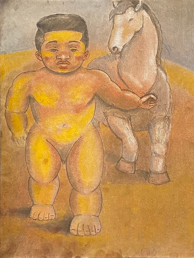 Inspired by Picasso’s *Boy Leading a Horse*, this pastel reimagines the scene through a stylized lens, portraying the figures with dwarfism features. The work transforms the classical grace of the original into a poignant study of strength and vulnerability, celebrating beauty, difference, and the timeless bond between humanity and nature.